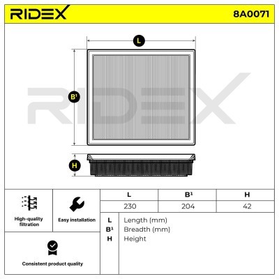 The RIDEX rectangular filter cartridge (Part No. 8A0071, EAN 4059191654277) is a foam-gasketed filtration solution measuring 230 mm (length) × 204 mm (width) × 42 mm (height), with a net weight of 177–227 g and a total weight of 0.284 kg. Designed for secure sealing and efficient particle retention, its rigid foam construction ensures durability and optimal airflow in compatible systems. Ideal for automotive or industrial applications, this cartridge balances precision engineering and reliable performance.